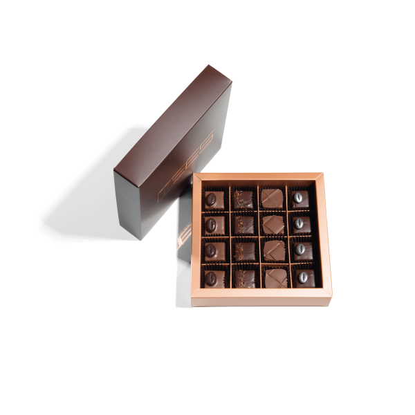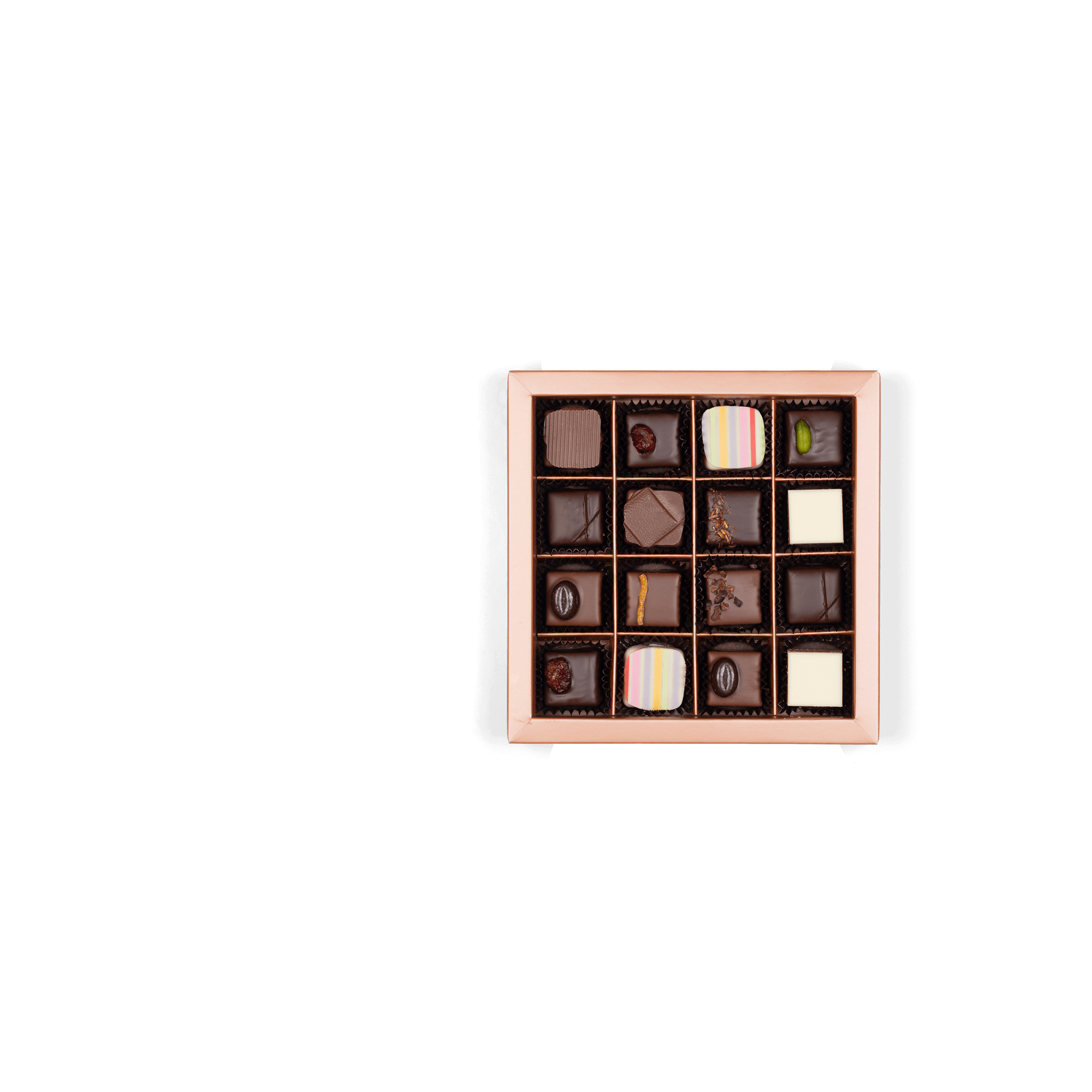 Mees Chocolates’ signature box with an assortment of 16 of our finest creations.