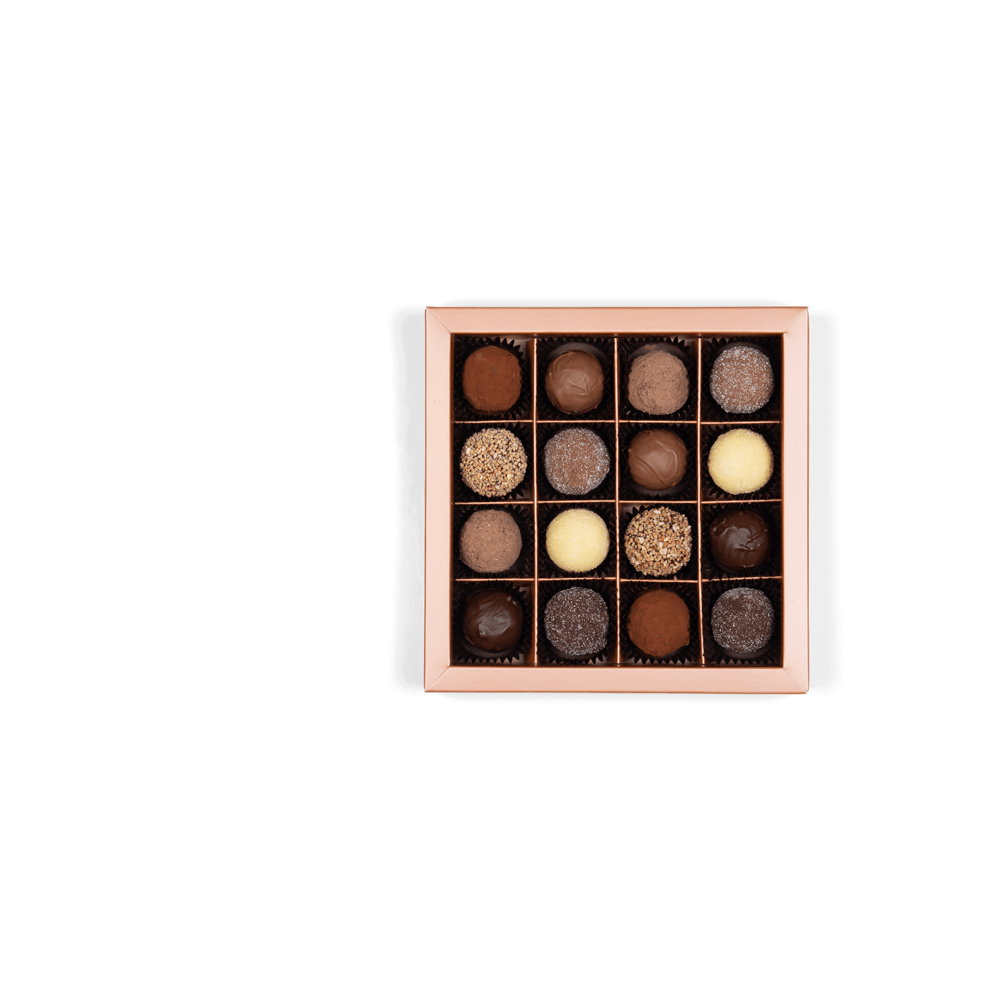Assortment of 16 handcrafted truffles filled with chocolate ganache subtly blended with the finest liquors and spirits.