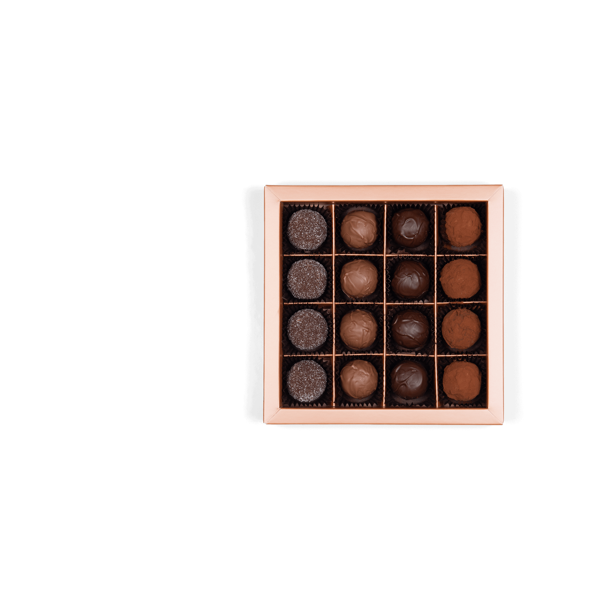 A selection of 16 handcrafted truffles filled with creamy chocolate ganache blended with Cognac, Grand Marnier, Champagne or Portwine.